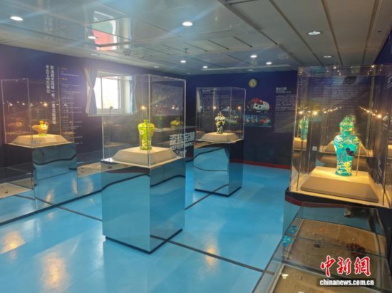 10月13日,全国首家海上流动博物馆升级改造落成仪式在三亚举行。图为“南海之梦”号邮轮上全新推出的“深蓝宝藏——南海西北陆坡一二号沉船考古成果特展”主题展览。张月和 摄